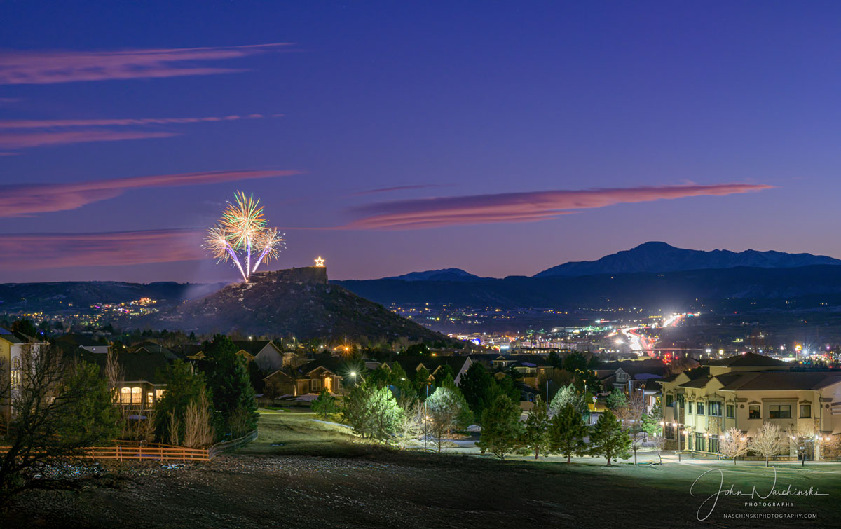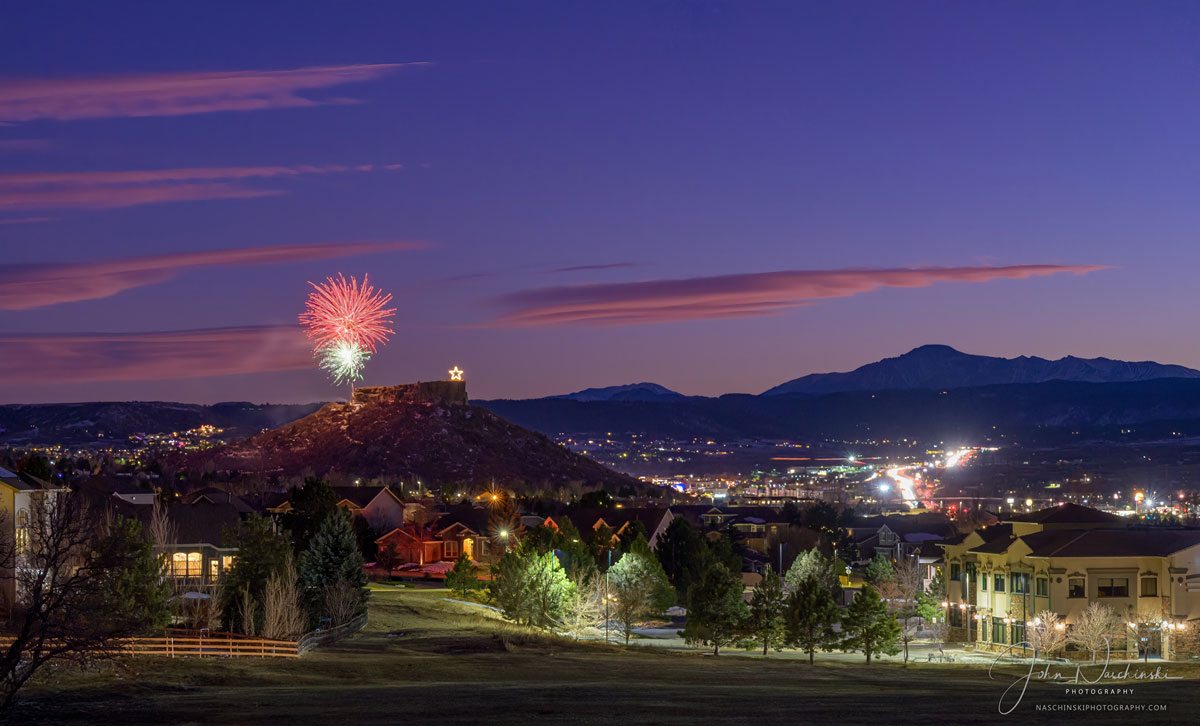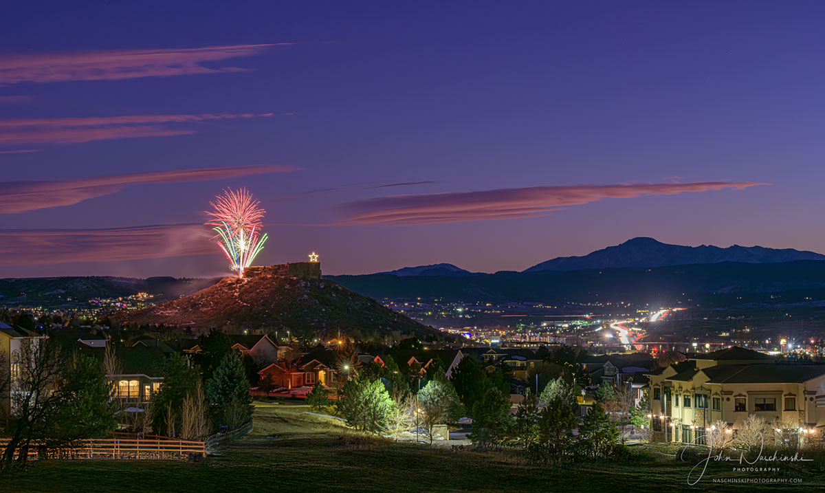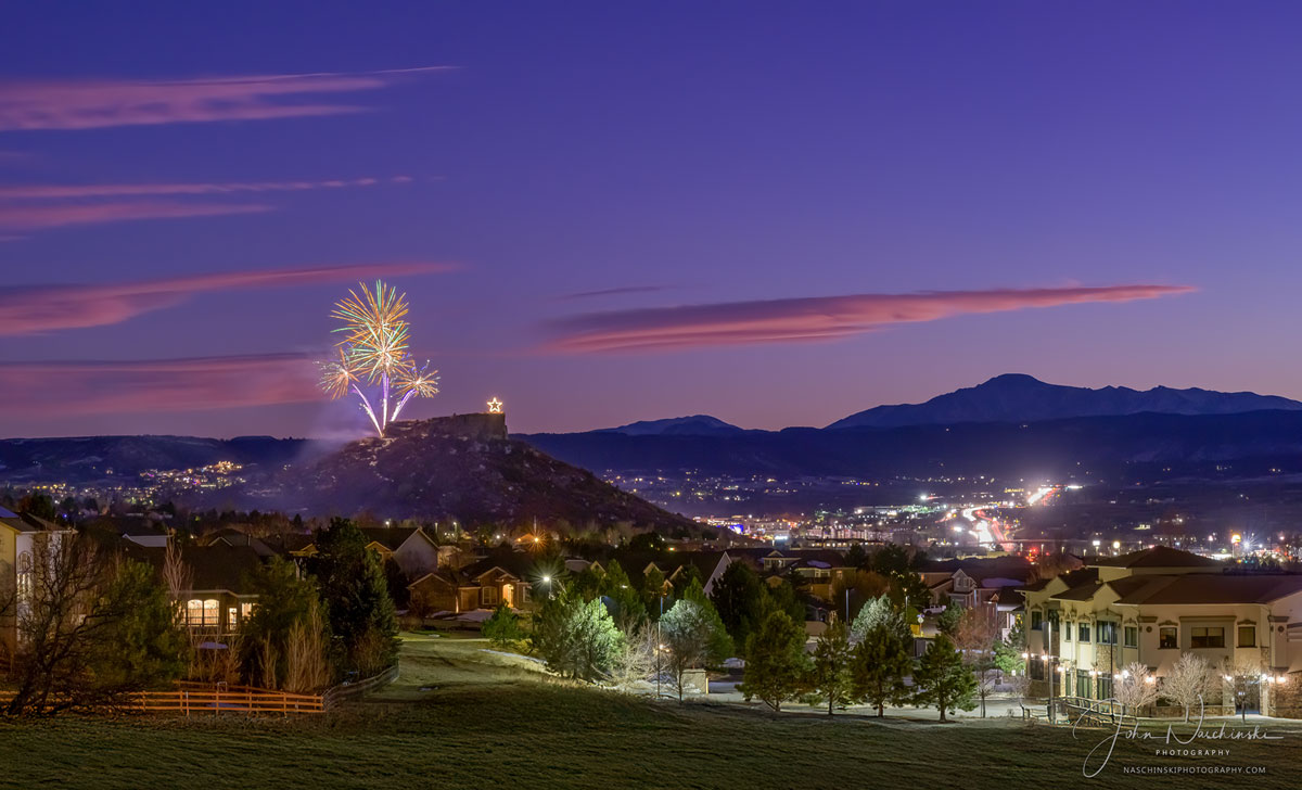 Photos of Castle Rock Colorado Starlighting Fireworks with Pikes Peak​. Located below are photographs from the November 2024 Castle Rock Starlighting Celebration. Colorful pink clouds and blue skies with a dusting of snow on Pikes Peak are featured in the first photo of our gallery located below. The Town of Castle Rock Starlighting has been a popular community event dating back to 1936. In the spirit of volunteerism and generosity the Starlighting tradition is celebrated downtown on the Saturday before Thanksgiving. We try to photograph the star lighting with unique approach each time we are fortunate enough to attend. This year we found a more unique perspective of the festivities from a bluff slightly above the town. The event was held on November 23, 2024 and each year is attended by people from all across Douglas County and the Colorado Front Range.