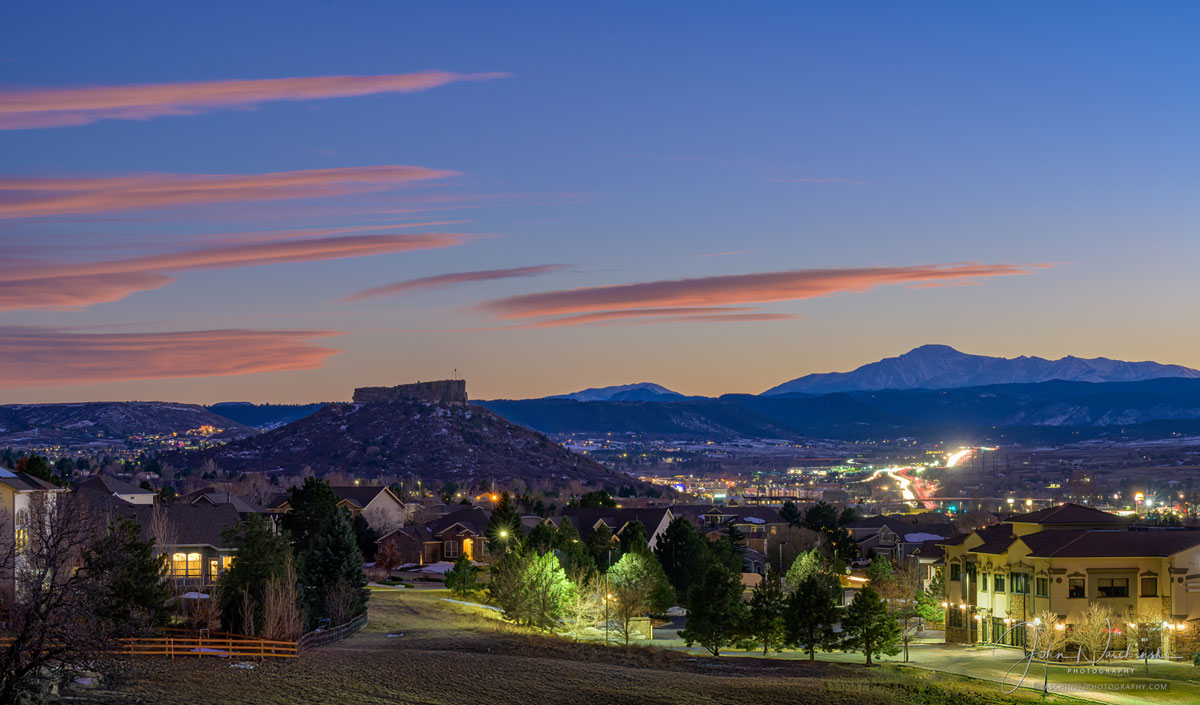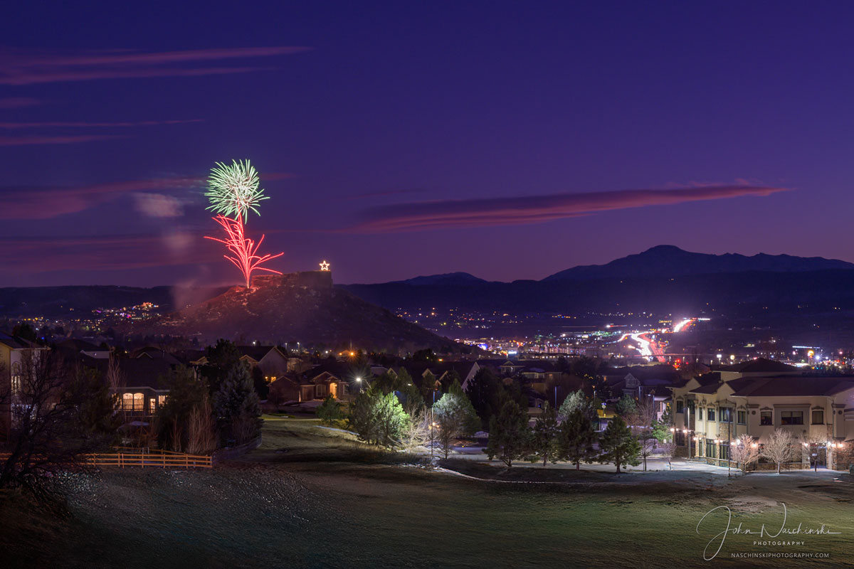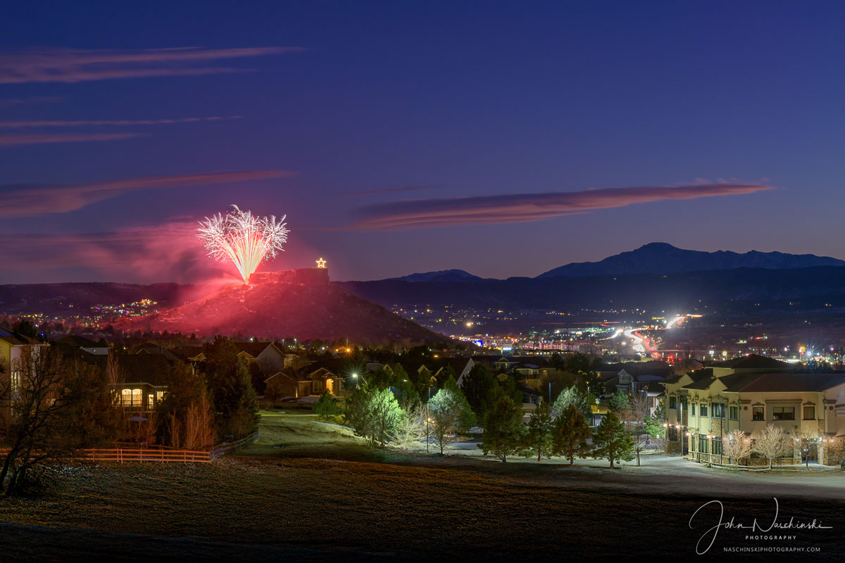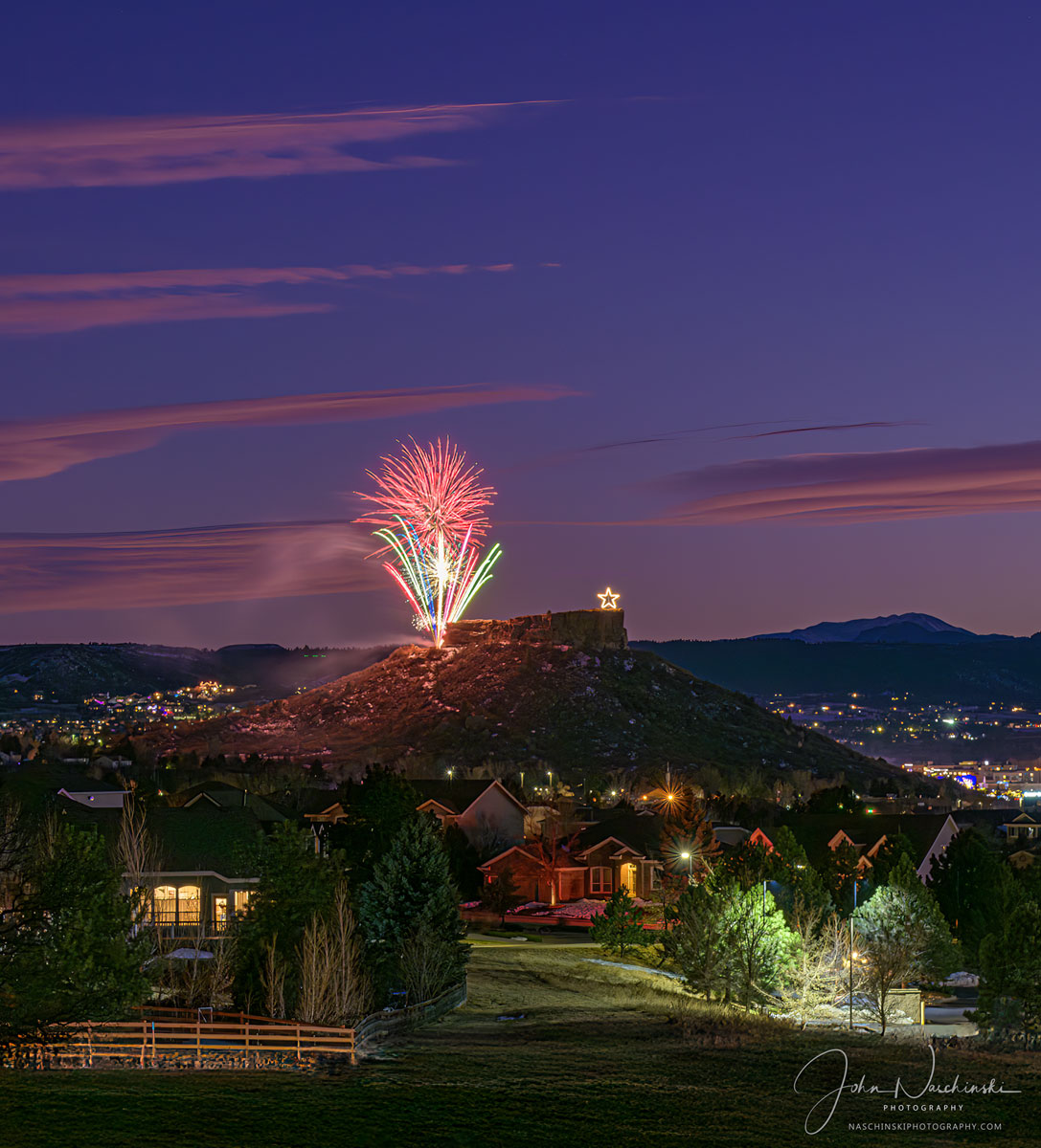 Photos of Castle Rock Colorado Starlighting Fireworks with Pikes Peak​. Located below are photographs from the November 2024 Castle Rock Starlighting Celebration. Colorful pink clouds and blue skies with a dusting of snow on Pikes Peak are featured in the first photo of our gallery located below. The Town of Castle Rock Starlighting has been a popular community event dating back to 1936. In the spirit of volunteerism and generosity the Starlighting tradition is celebrated downtown on the Saturday before Thanksgiving. We try to photograph the star lighting with unique approach each time we are fortunate enough to attend. This year we found a more unique perspective of the festivities from a bluff slightly above the town. The event was held on November 23, 2024 and each year is attended by people from all across Douglas County and the Colorado Front Range.